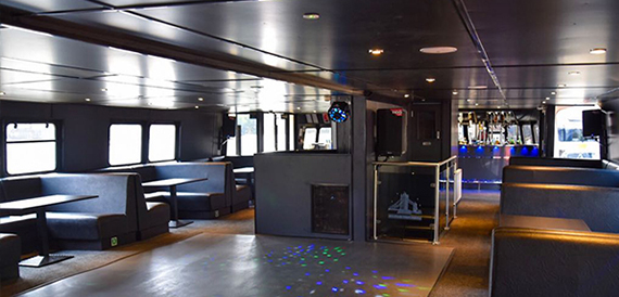 The VIP area can be open to all passengers or can be closed off and used as a VIP room for special guests only. Leading off the saloon opposite the main bar you can walk down into the ultra-modern club with black modern seats wrapped around the large dance floor, this also comes with a VIP bar which can be open for cocktails, champagne or open as a normal bar depending on each client’s requirements and event.